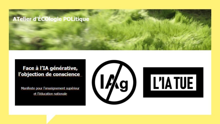 L’Atécopol lance un manifeste intitulé « Face à l’intelligence artificielle générative (IAg), l’objection de conscience » que vous pouvez lire et signer dans ce formulaire. Le texte ci-dessous permet d’approfondir la réflexion au travers d’un ensemble d’éléments de réponse face aux arguments les plus communs circulant dans les institutions de l’Éducation Nationale et de l’Enseignement Supérieur et Recherche (et au-delà) pour légitimer la diffusion de l’IAg.